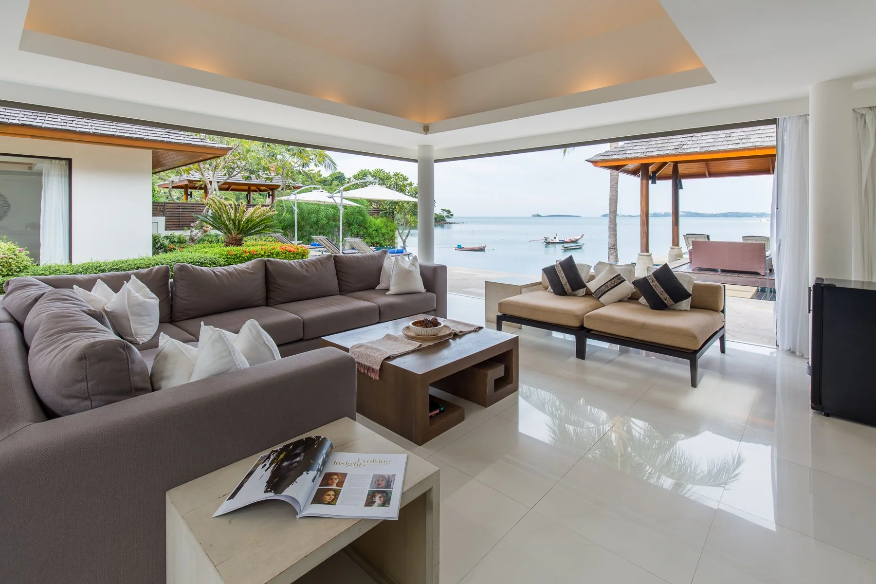 Modern Asian decor meets tropical style at this hillside villa, which offers a sea view from its upper-floor spaces.